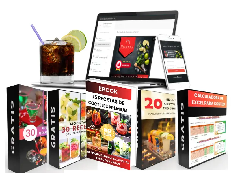- E-book con 75 recetas de cocteles novedosos y en tendencia paso a paso y con medidas exactas.